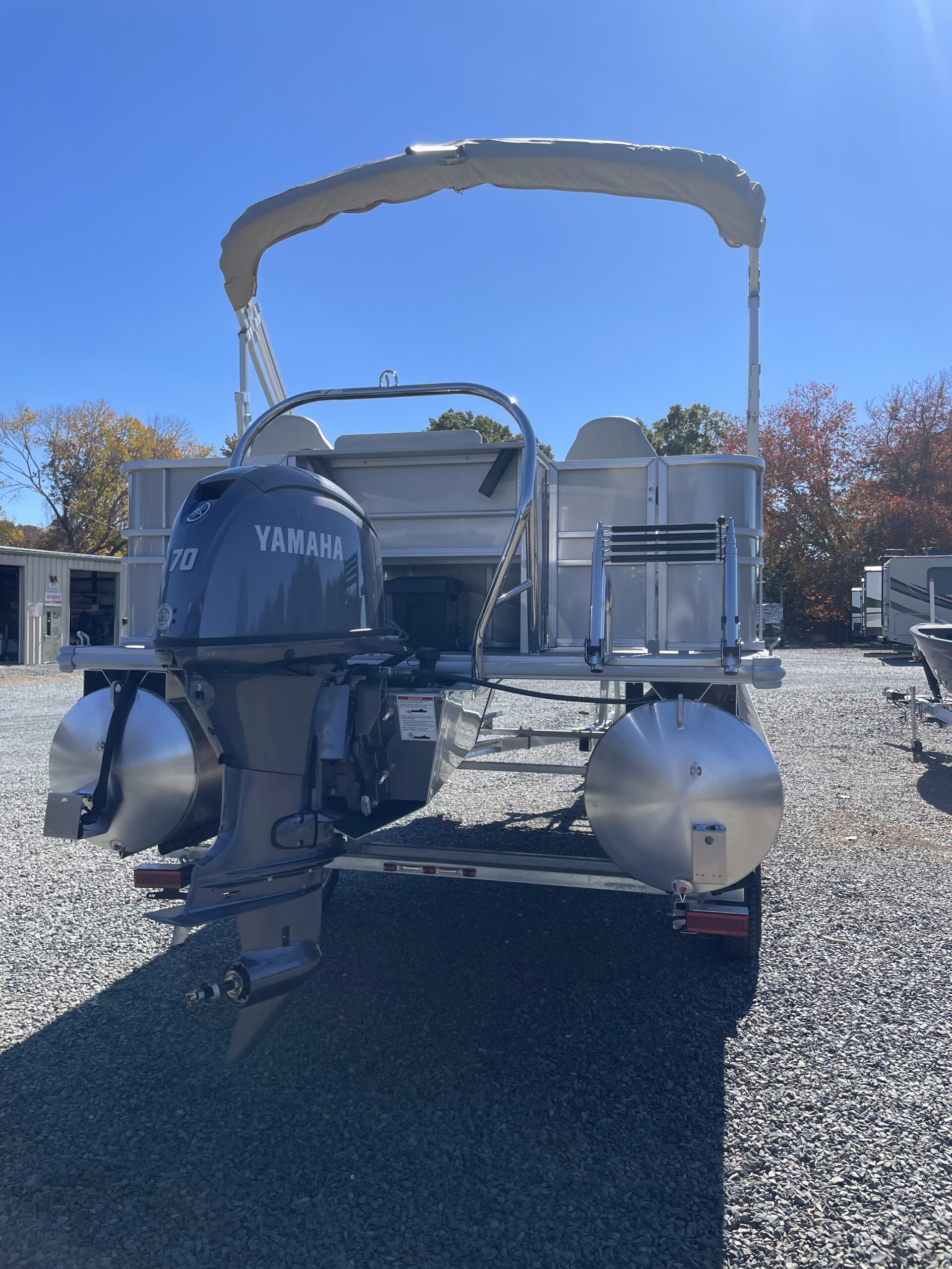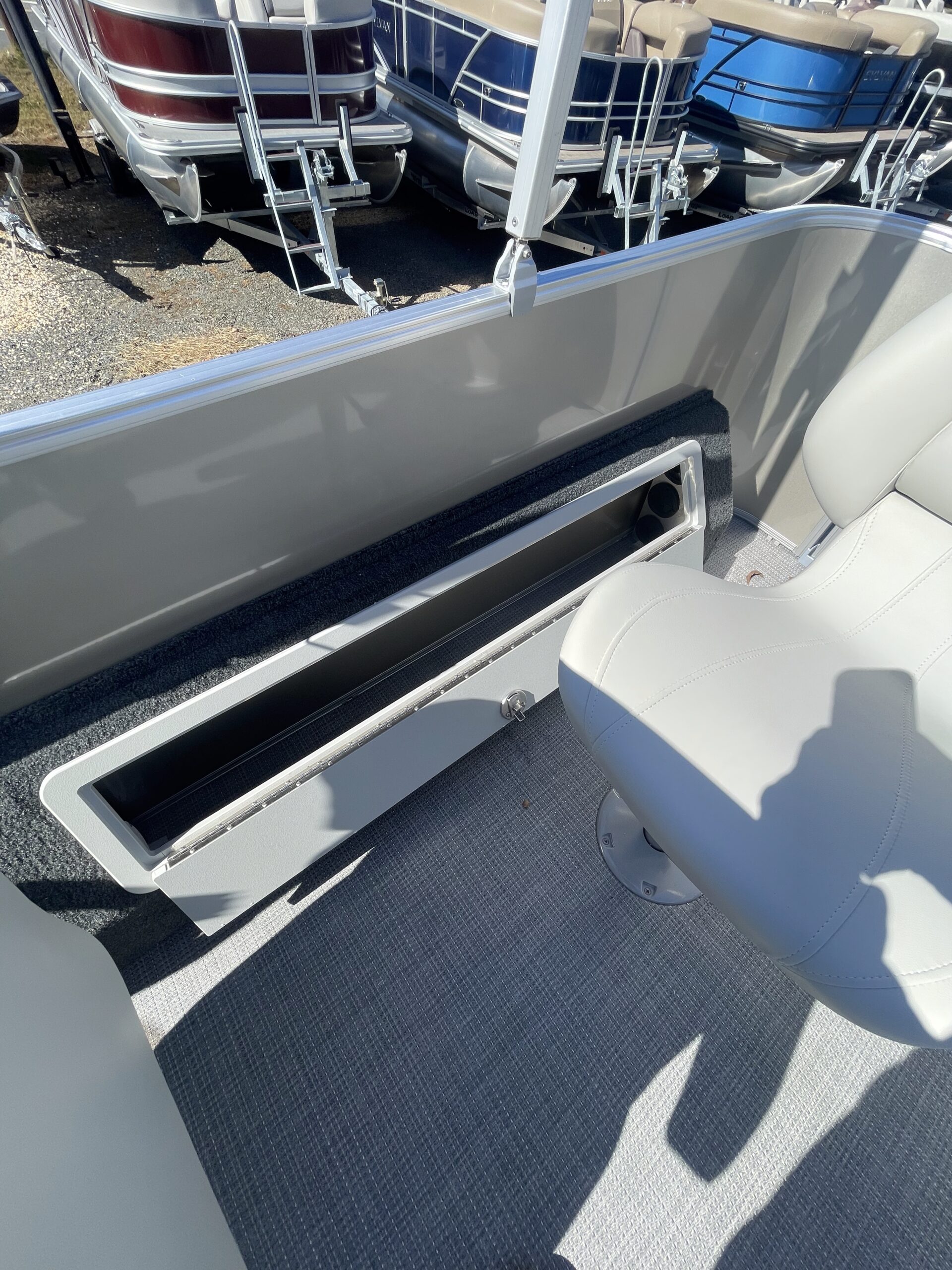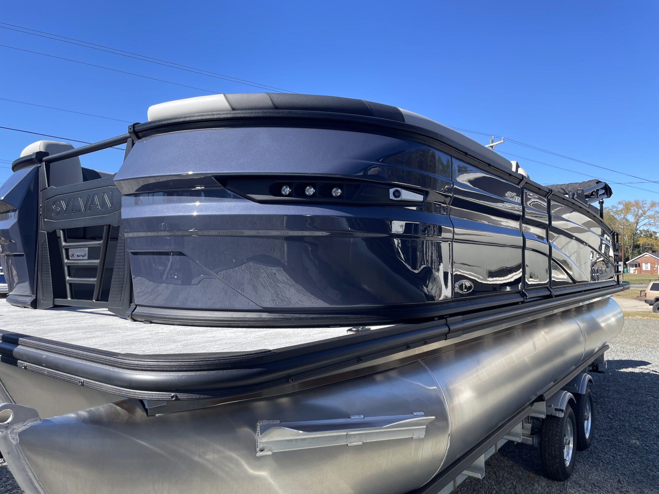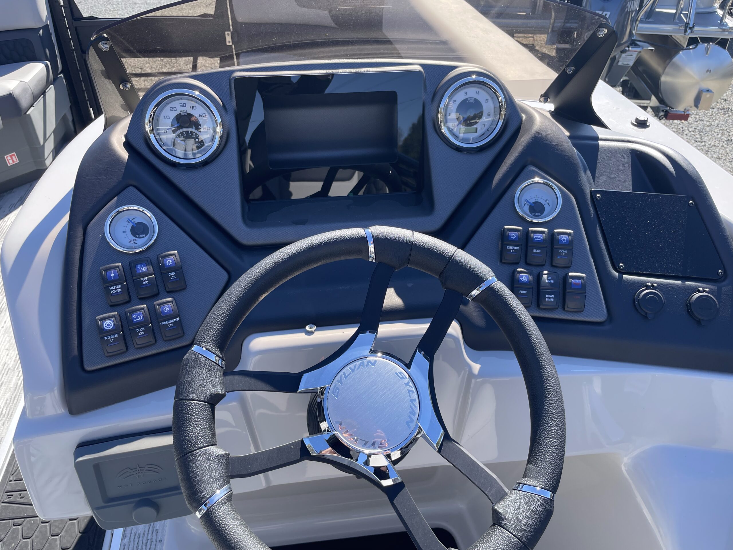 • tritoon, wave blue paneling, tan furniture, power bimini top, comfort & performance package, hydraulic steering, mood & underwater lights, deluxe exterior ski tow bar
