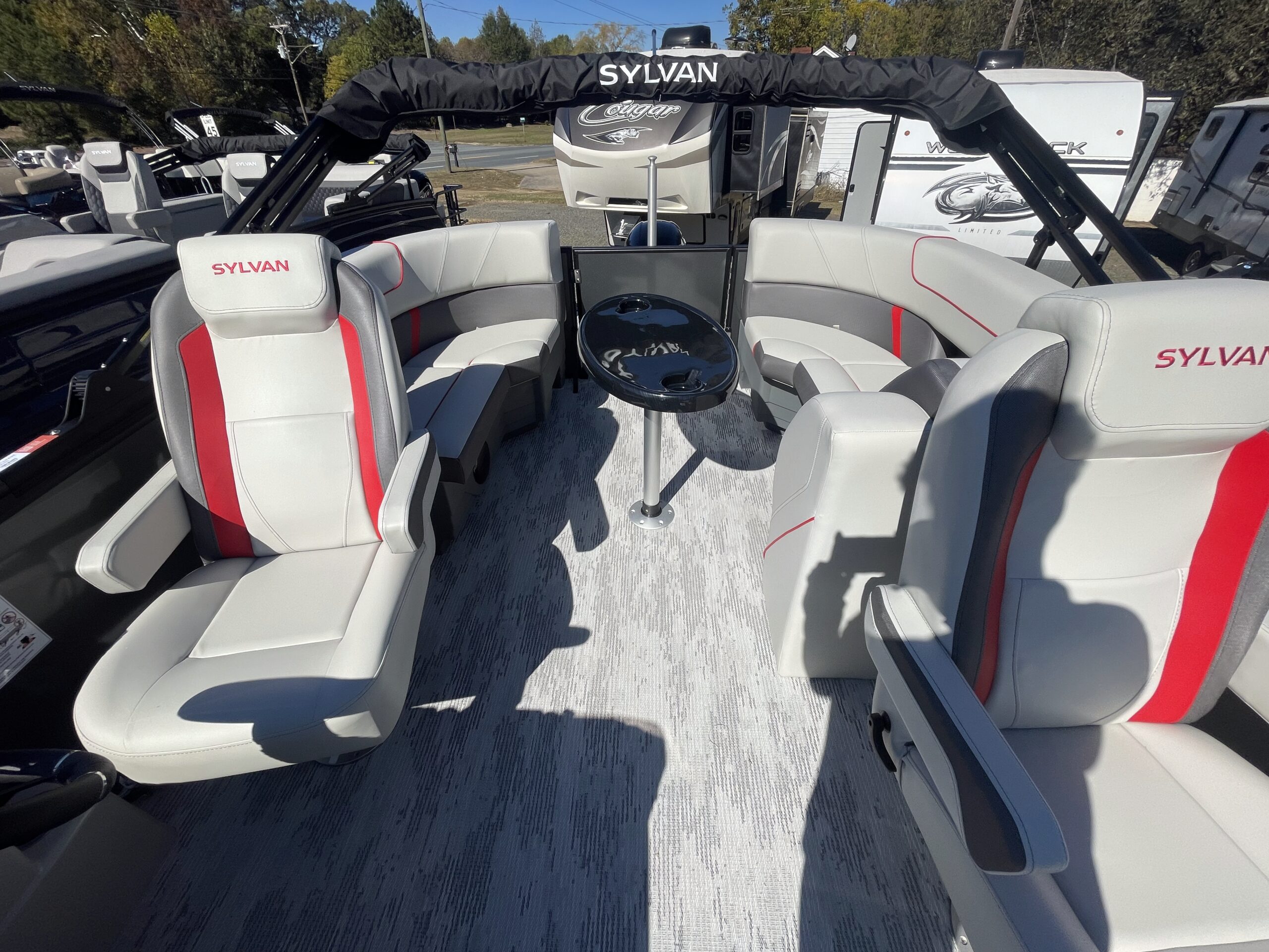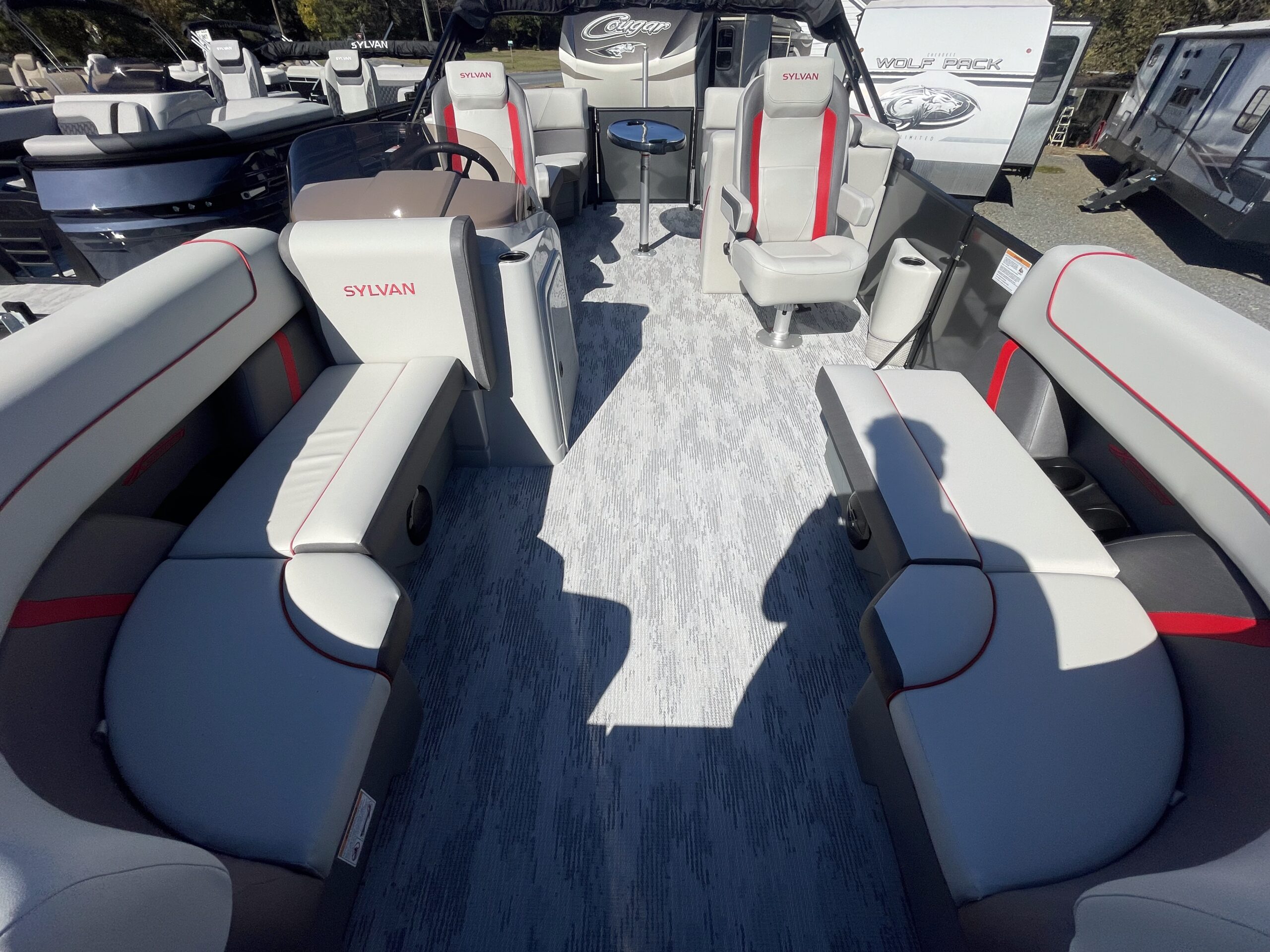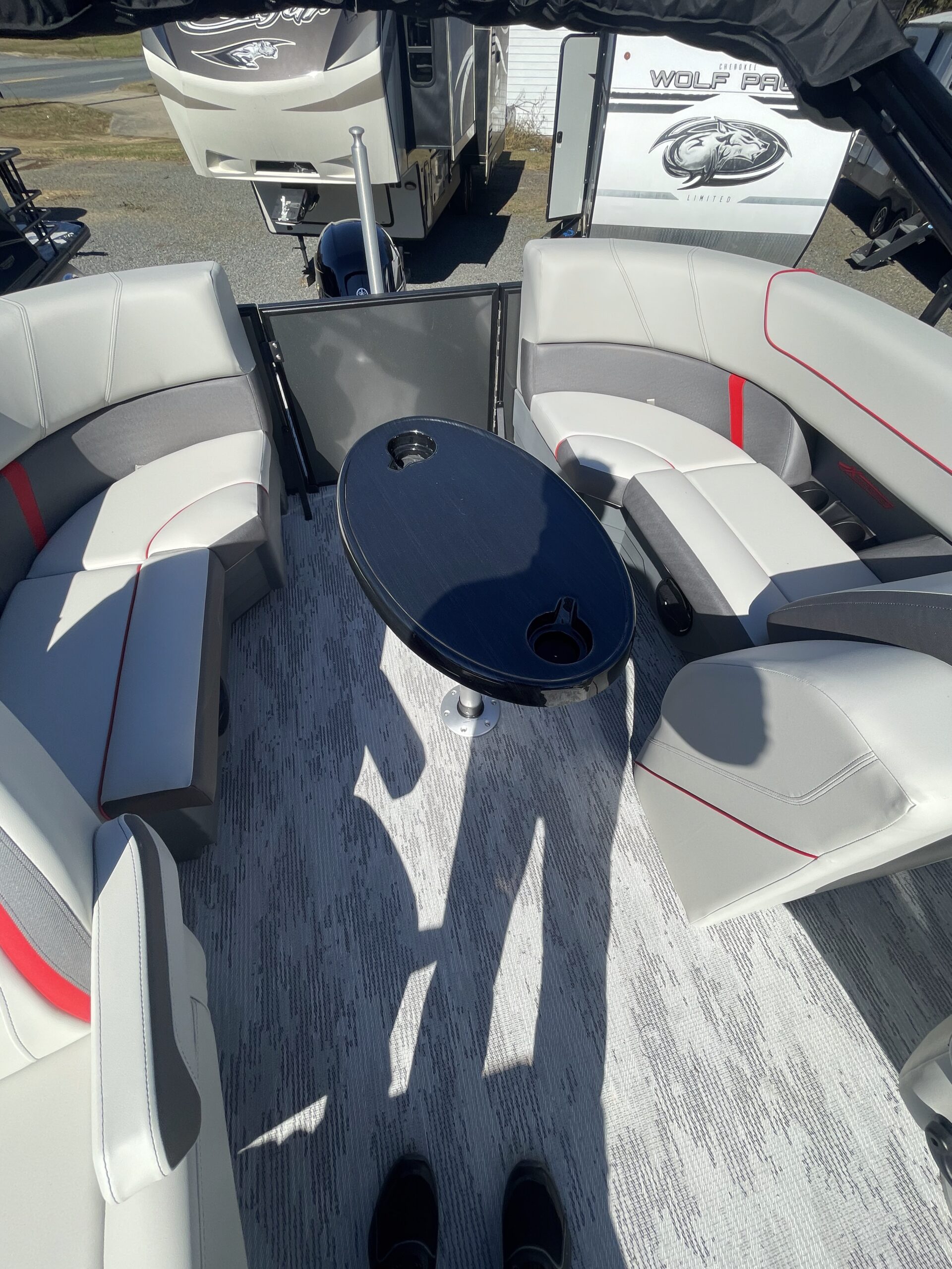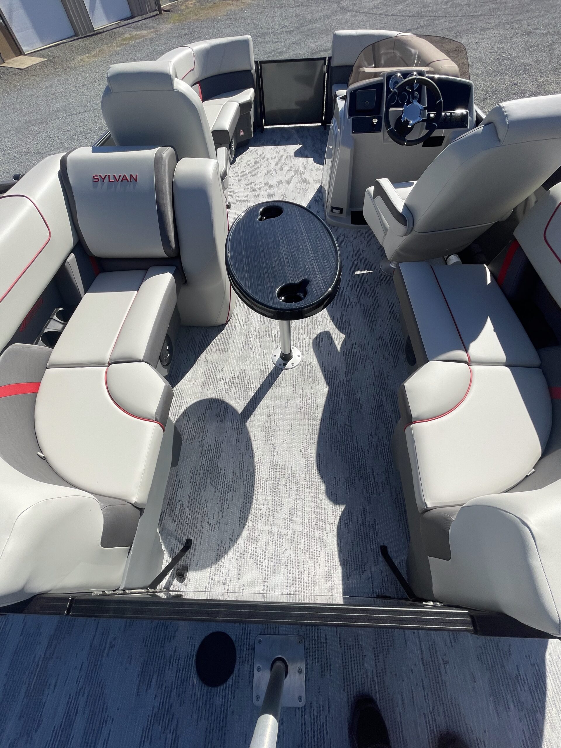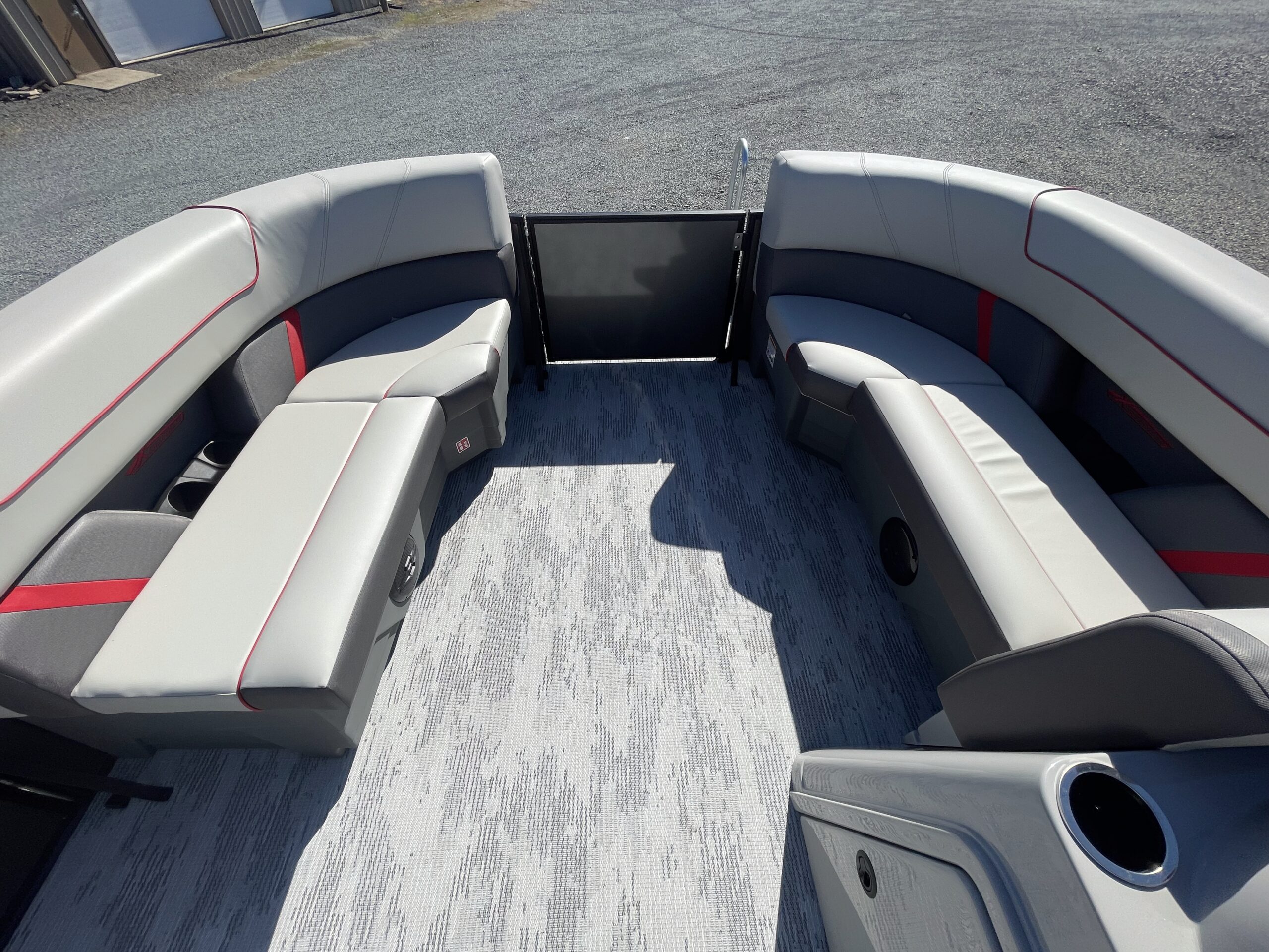 • Tritoon, carbon paneling, stone seaweave flooring, grey  w/ red accent furniture, black power bimini, performance package, hydraulic steering, pylon ski tow bar