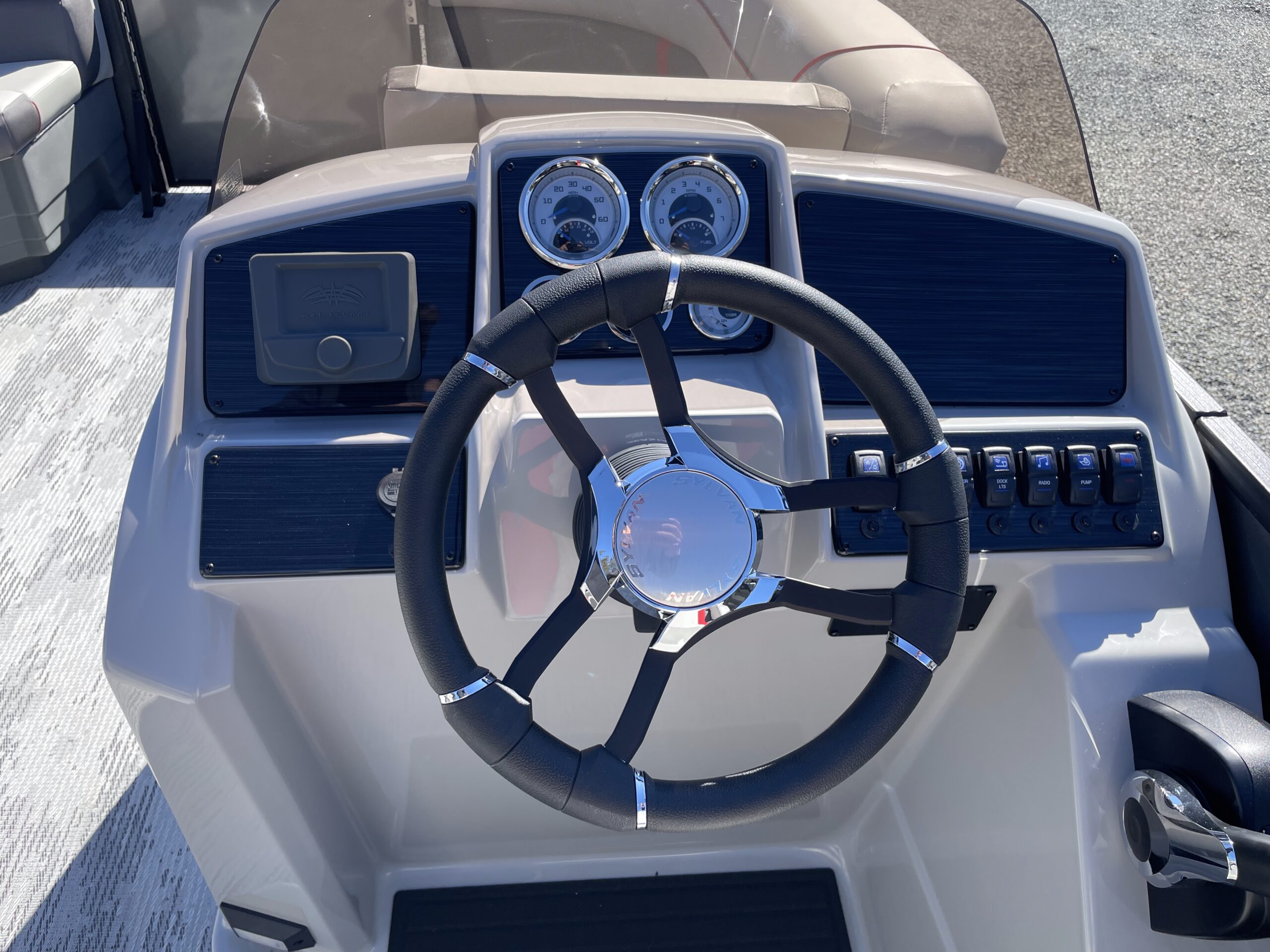 • tritoon, steel blue fiberglass paneling, stone seaweave, light grey w/ dark grey accent furniture, power bimini, performance & audio+ package, hydraulic steering